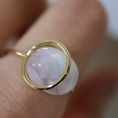 静かに佇むサークルが、指先に光をまとって浮かびあがる。360°どこから見ても美しい天然石の、ありのままの輝き。光とともに、あなたの日常に寄り添うリングです。