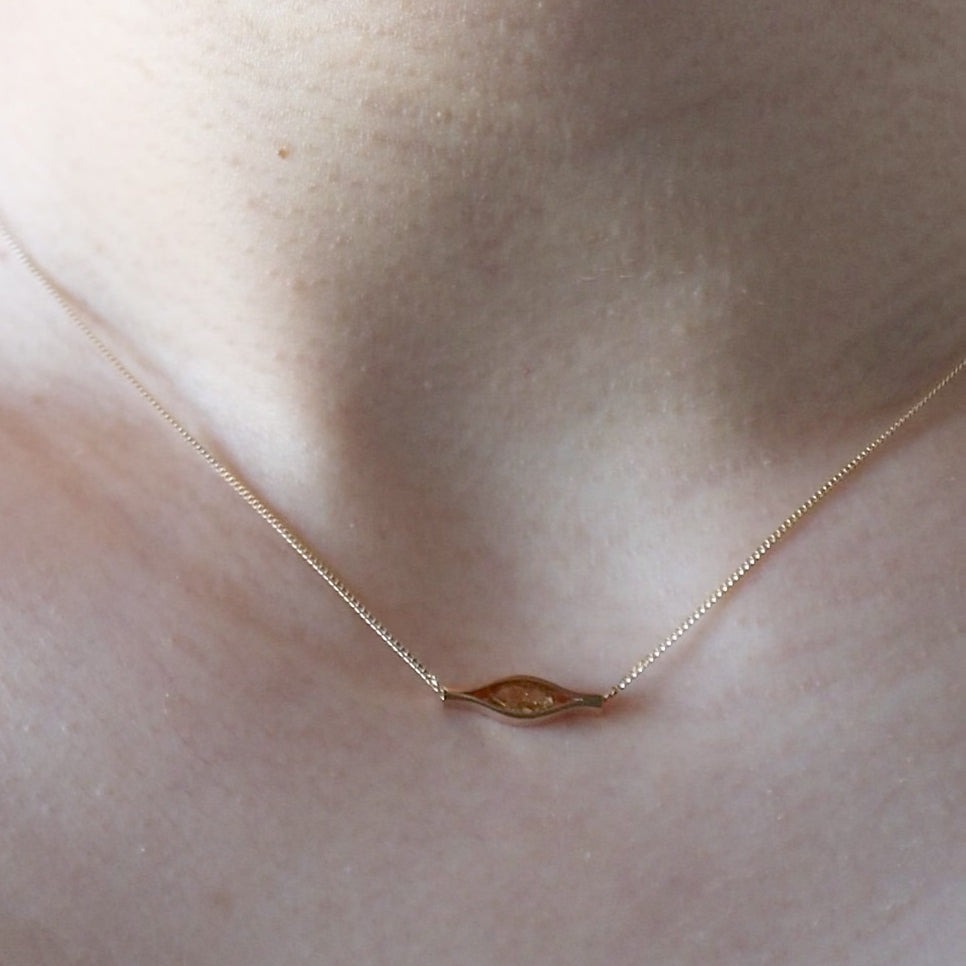 天然石が隙間から顔を覗かせるユニークなスタイルで、ミニマルながらモードな印象のネックレスです。