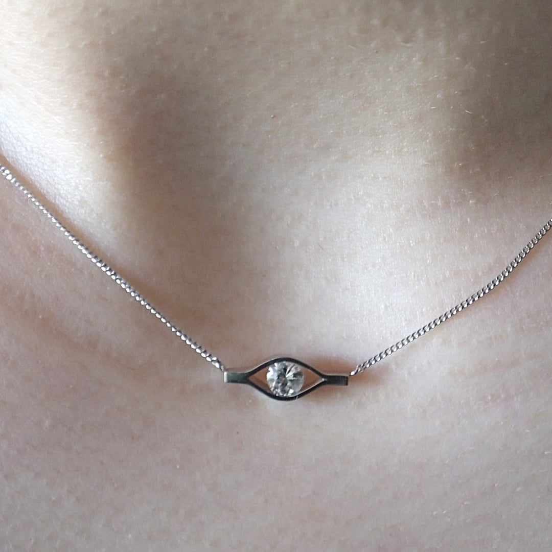 天然石が隙間から顔を覗かせるユニークなスタイルで、ミニマルながらモードな印象のネックレスです。