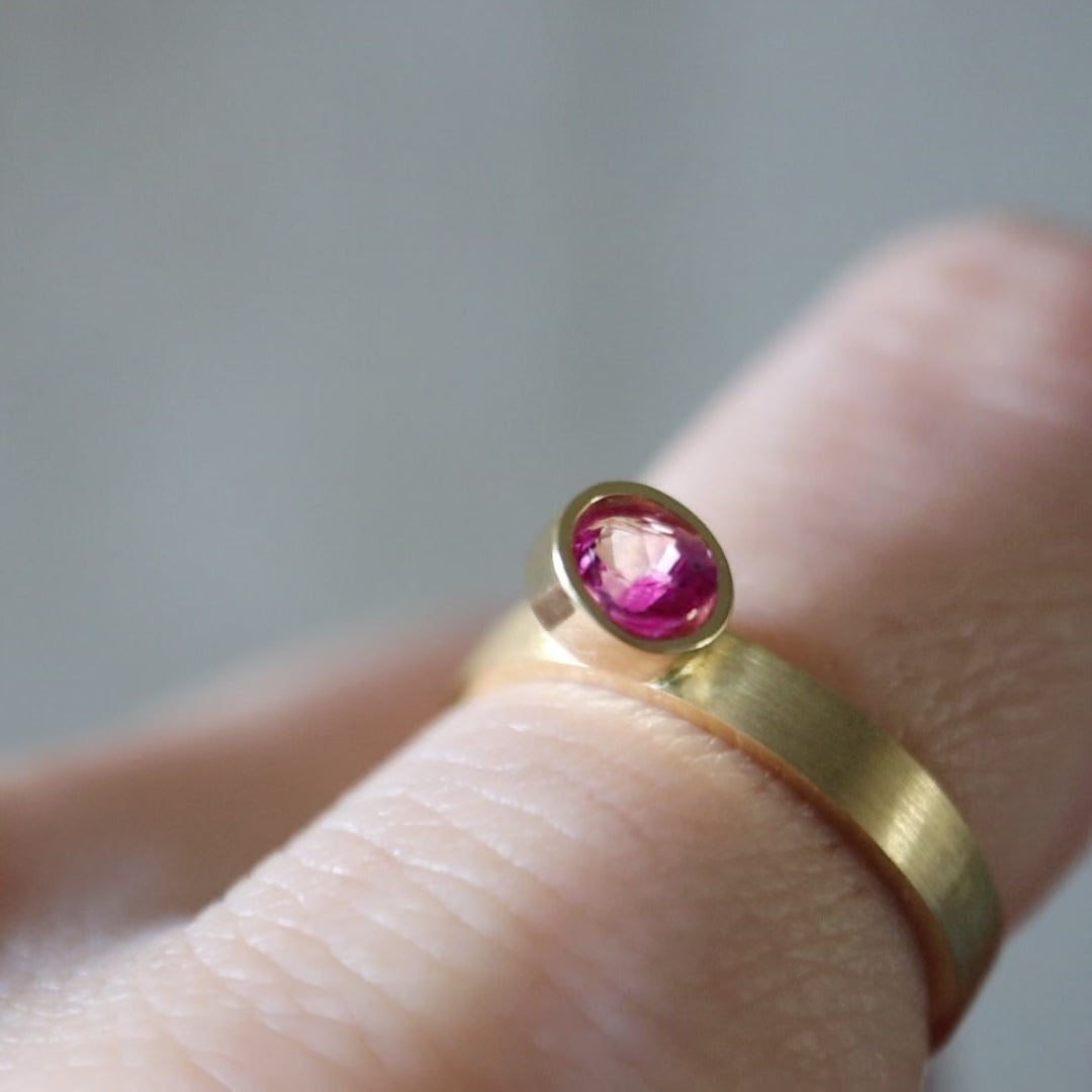 特別な石留め方法は光を多く取り込み、ピンクサファイアの煌めきを引き立てます。