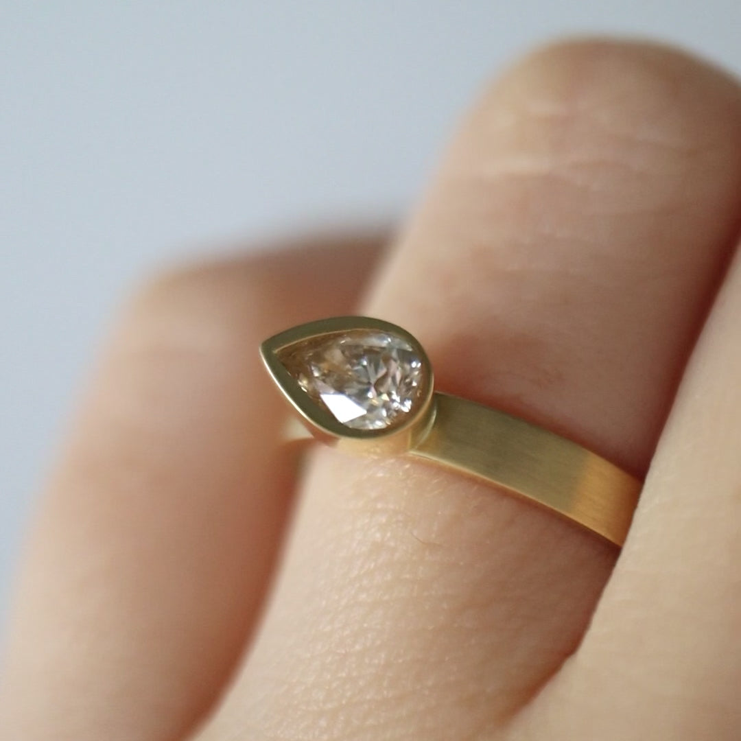 しずくのようなペアシェイプ型のダイヤモンドが、凛と佇むリングです。